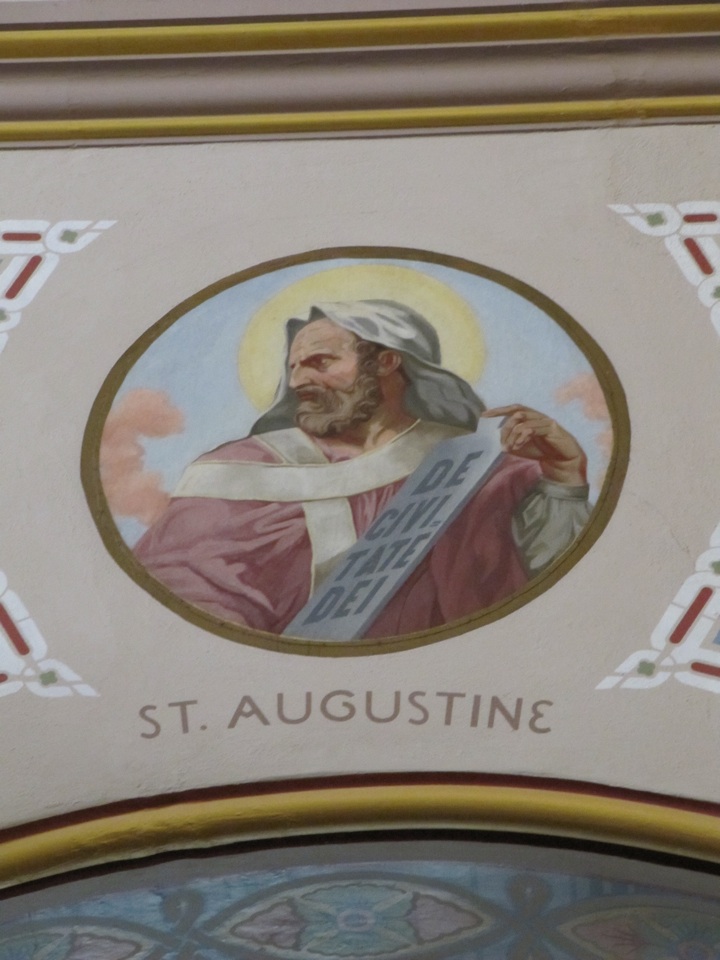 The last time I sat down and read some Augustine was during a graduate historiography seminar with Dr. Jim Mochoruk at the University of North Dakota, Grand Forks. We did not read The Confessions, but instead read The City of God (or large chunks of it), the title of the work that is painted into the photo of the Augustinian fresco in Richardton Abbey, western North Dakota. When you enter the sanctuary, look up and just to the left. You’ll see Augustine.