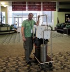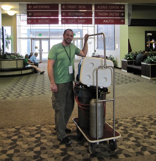 Mike Frohlich hauls around his craft brewing luggage at the CanadaInn on March 17, 2012 in Grand Forks, North Dakota.