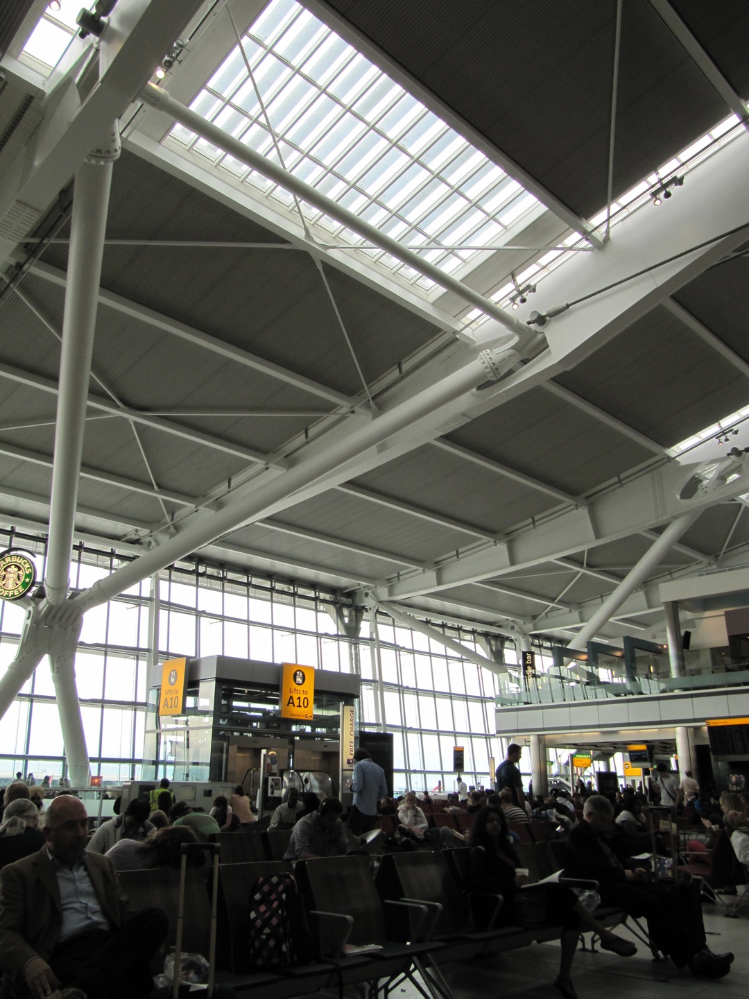 Terminal 5, the correct terminal at Heathrow, and the obligatory Starbucks and some clear-span interior architecture. The airport’s architecture gives the feeling that one is inside of an airplane wing.