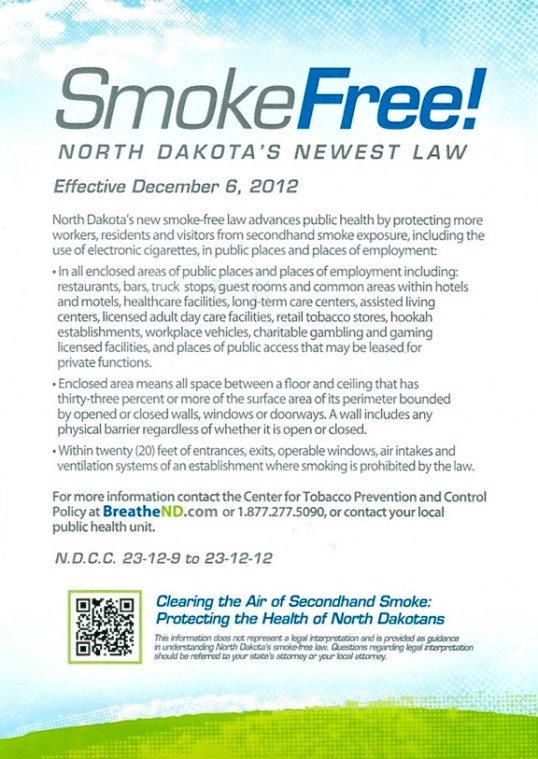 North Dakota Smoke Free announcement retrieved from the mail box on December 5, 2012.