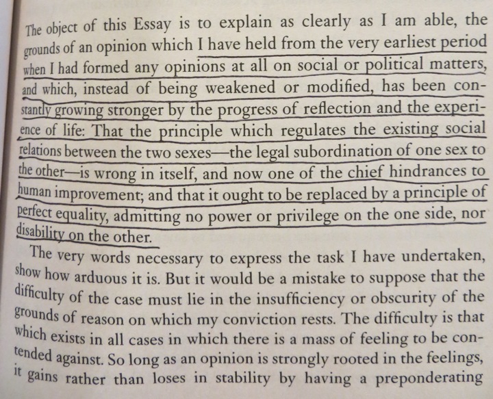 …I have held from the very earliest period when I had formed any opinions at all on social or political matters, and which, instead of being weakened or modified, has been constantly growing stronger by the progress of reflection and the experience of life: That the principle which regulates the existing social relations between the two sexes — the legal subordination of one sex to the other — is wrong in itself, and now one of the chief hindrances to human improvement; and that it ought to be replaced by a principle of perfect equality, admitting no power or privilege on the one side, nor disability on the other.