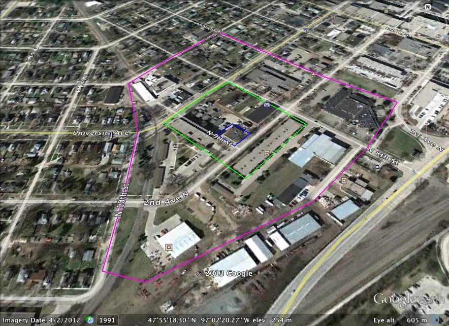 Some months ago friends Bill Caraher and Bret Weber (professors at one of my — ahem — alma maters, this the University of North Dakota) asked if I would be interested in making a contribution to their Neighborhood History series in Grand Forks. Even before Caraher finished the sentence, I remember saying, “Yes, yes. I’ll do it. I would love to.” So after paying my research location a second visit, I started thinking about how I would outline my research area. The primary area concerns 824 2nd Avenue North, and this falls just a few blocks beyond the boundaries of the Grand Forks downtown historic district.