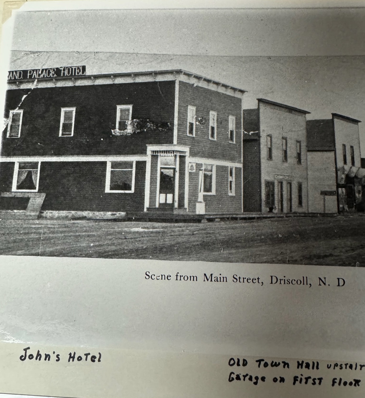 On August 3, 2025, I had a chance to stop along where the north-south automotive road crossed the east-west railroad tracks at Driscoll in an attempts to better acquaint myself with the landscape, and imagine what had been 110 years prior. Fast forward to this week of December 14, 2025, and the text message thread: Kate Herzog (also a commissioner for Bismarck Parks & Recreation District) mentioned some of her great grandparents owned the Grand Palace Hotel, she thinks in the 1910s. Perhaps a bit later. Now cut back to Era Bell Thompson’s 1946 memory of her family relocating from a house “to the empty hotel on the edge of town” (page 26 of American Daughter). Was this the same hotel? I mean, how many hotels could have a town of approximately 100 people supported in the 1910s?