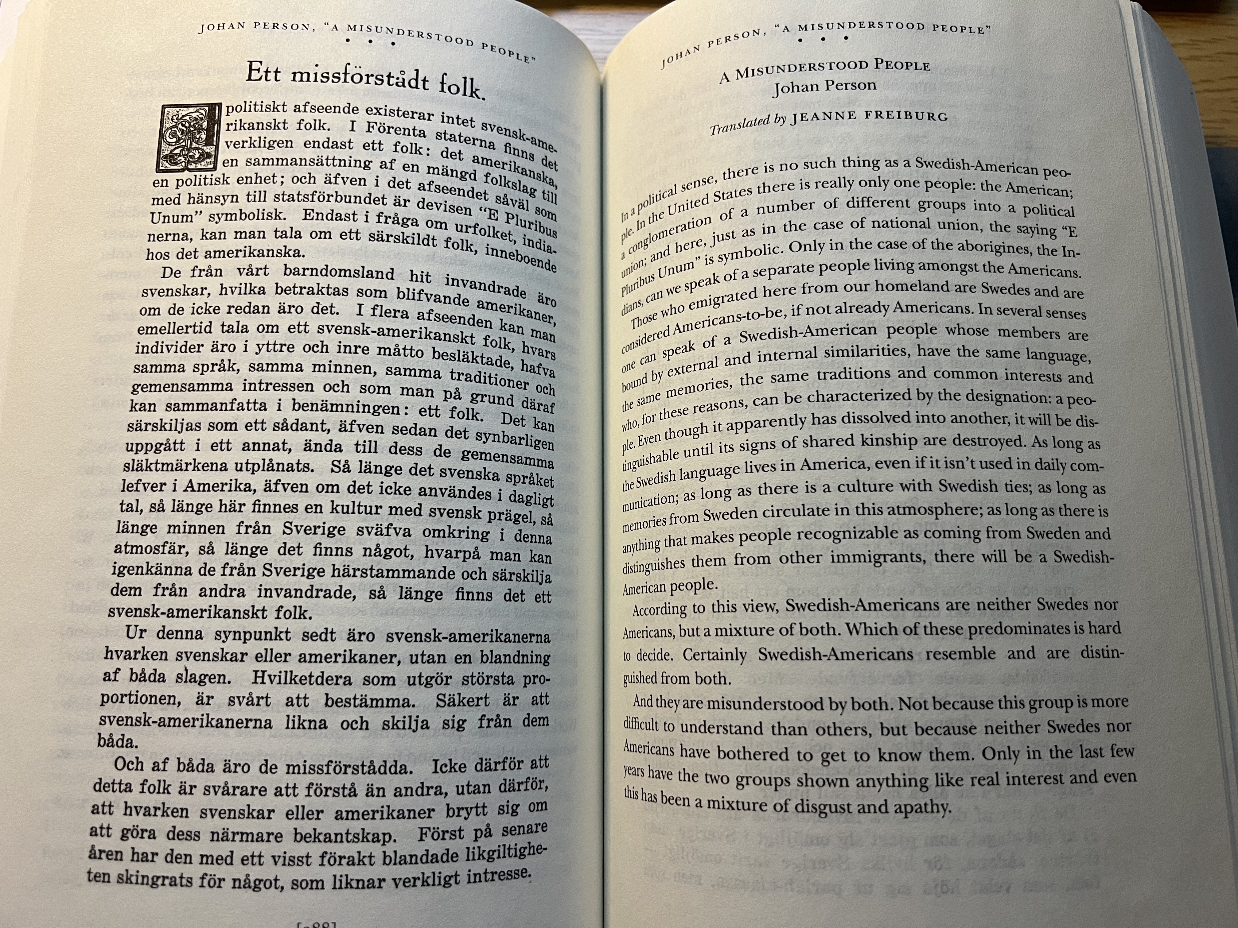 Here’s an historical case study on that, too: in The Multilingual Anthology of American Literature: A Reader of Original Texts with English Translations, edited by Marc Shell and Werner Sollors (New York and London: New York University Press, 2000), the section on Swedes, the opening page looks like this: