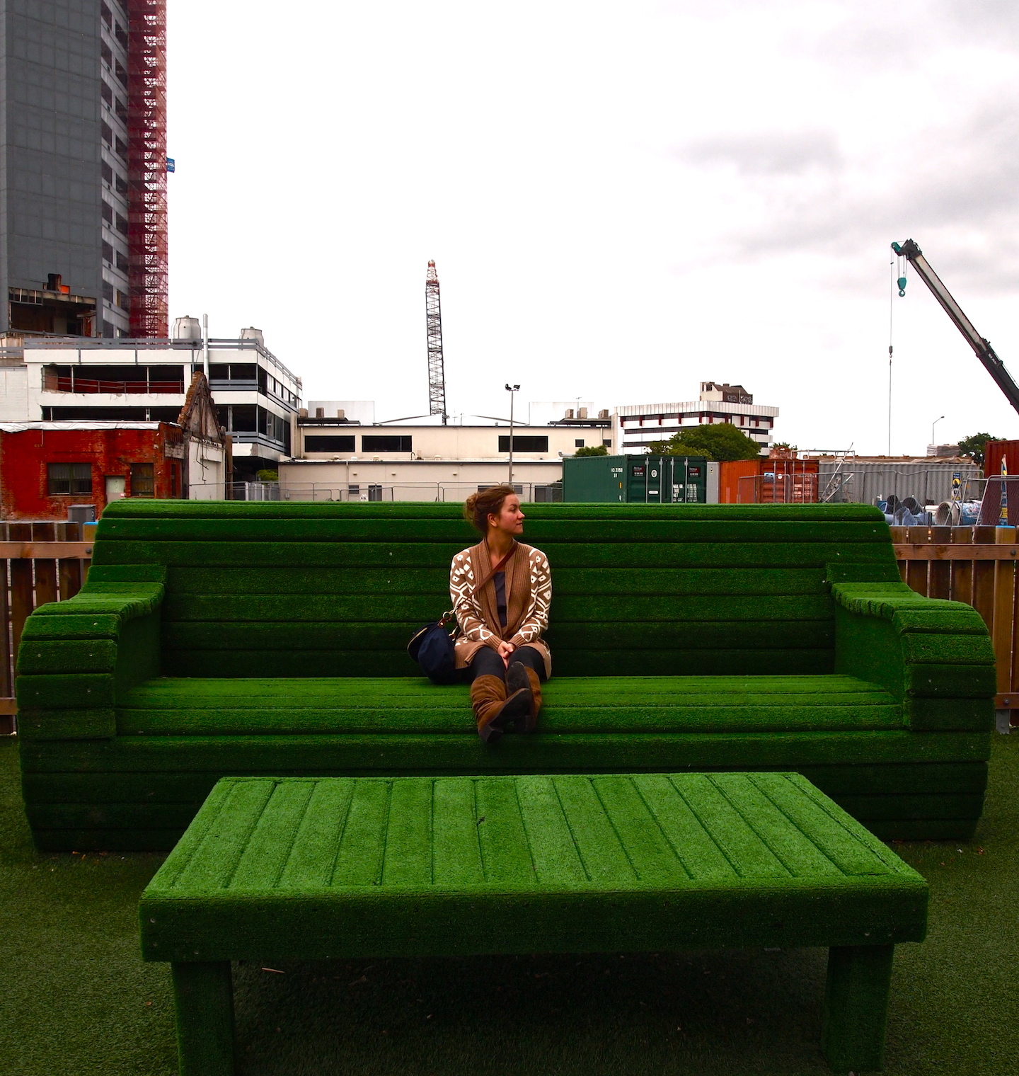 Public Art that impressionistically simulates an outdoor living room in Cathedral Square, Christchurch. Molly McLain is obliging the artists, and taking it all in.