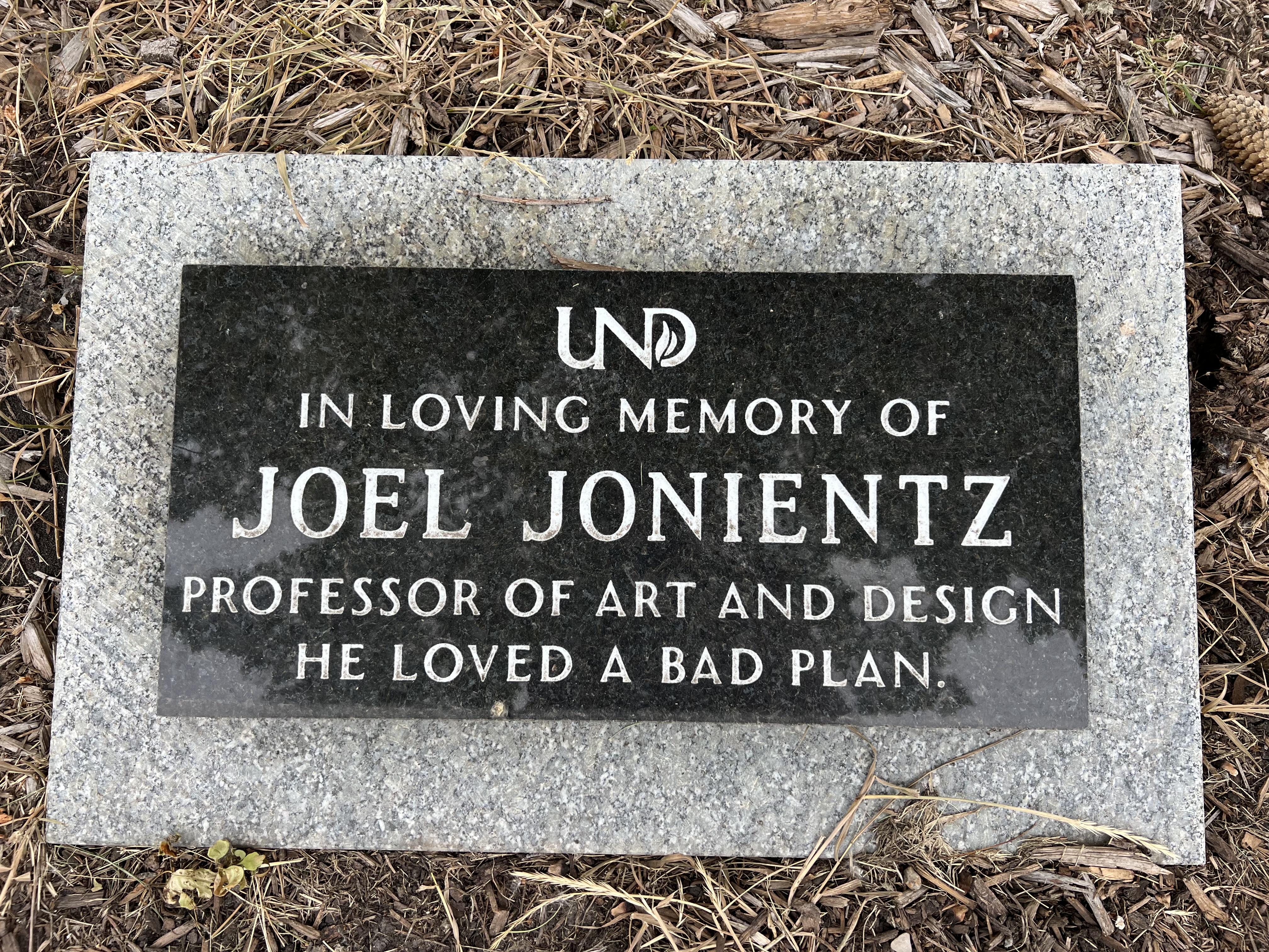 I’m on site at the University of North Dakota this week for professional work and research. While on site, walking across the campus mall, it was a pleasure to see the memorial tree of the late Joel Jonientz, professor of art and design who, in the inscription of his eternal self descriptor, always “loved a bad plan.” Other phrases that come to mind when recalling Joel (he and I interacted directly like 2-5 times in the course of us walking the earth at the same time): “You wanna know how you accomplish something?” This was a rhetorical line of questioning from Joel. He said this to me in like February of 2013 while we were at a high top table at the used-to-be HoDo, now the remodeled BlarneyStone in downtown Fargo. This as we were ramping up with collaborators to carry forward the first global Punk Archaeology Un-Conference at the historic and since bulldozed Sidestreet Tavern (one finds as the decades proceed, one is saying “the old one, not the new one” a lot more and more). He’d follow this by saying something to the effect of, “Ninety-eight percent of it is will power. That’s it.” Not all in one big shot will power. Like sustained will power. Willing power, making incremental gains, sometimes of the magnitude that could be similarly gauged by clipping a hang nail.