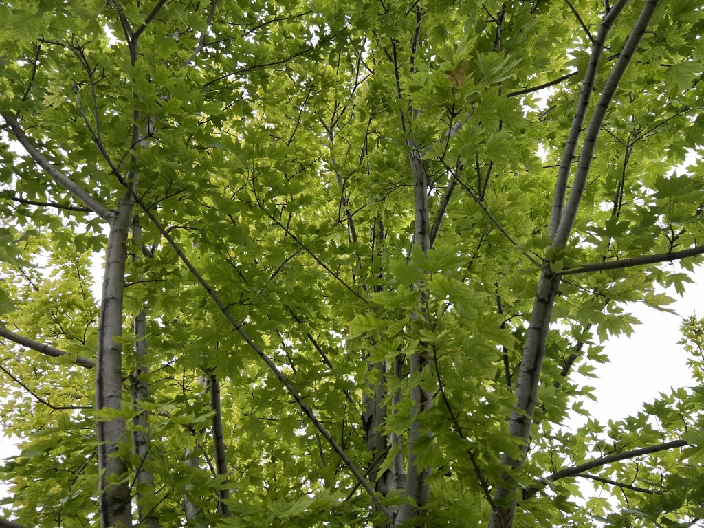Anyhow, some description of the landscape architecture and my own mental point of entry where Joel’s memorial tree resides. The tree itself is a silver maple. I rant the tree image through the PictureThis app on the iPhone. Joel (and the ripple effect of his collaborators) liked detail. So here is some detail. The silver maple is also known as soft maple, water maple, river maple, white maple, creek maple. The latter name, the creek maple, is fitting, as his memorial and this tree is planted near English Coulee (aka creek; and aka “English” as in a departmental discipline) on UND’s campus. The Latin (“It’s a dead language!”) name is Acer saccharinum. It is one of the most common deciduous tress in the United States and southeast Canada. So hardiness zones of 5-9, sustaining Fahrenheit temps from -4 to 100 degrees. It can get vertical from 5-9 stories high. I looked up and snapped this photo of the canopy that arches out over the sweet granite memorial to Joel. It’s okay to lay in the grass and look up at tree canopies.